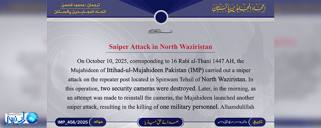 در بیانیه نخست این ائتلاف تروریستی آمده است: مجاهدان ما در 10 اکتبر پاسگاه نیروهای پاکستانی در منطقه اسپین وام شهرستان وزیرستان شمالی را با اسلحه تک تیرانداز هدف قرار داده و دو دوربین نظارتی را منهدم کردند.