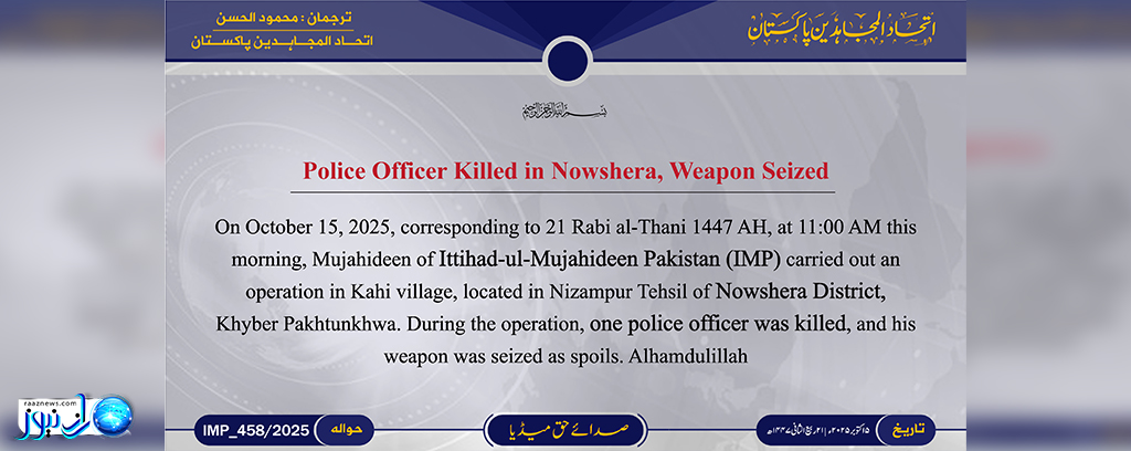 این ائتلاف تروریستی در بیانیه ای دیگر با بر عهده گرفتن مسئولیت حمله نیروهای پلیس در شهرستان نوشهره اظهار داشت: مجاهدان ما در 15 اکتبر طی عملیاتی در روستای کاهی از توابع بخش نظام پور شهرستان نوشهره یک نیروی پلیس را به هلاکت رسانده و اسلحه وی را به غنیمت گرفتند.