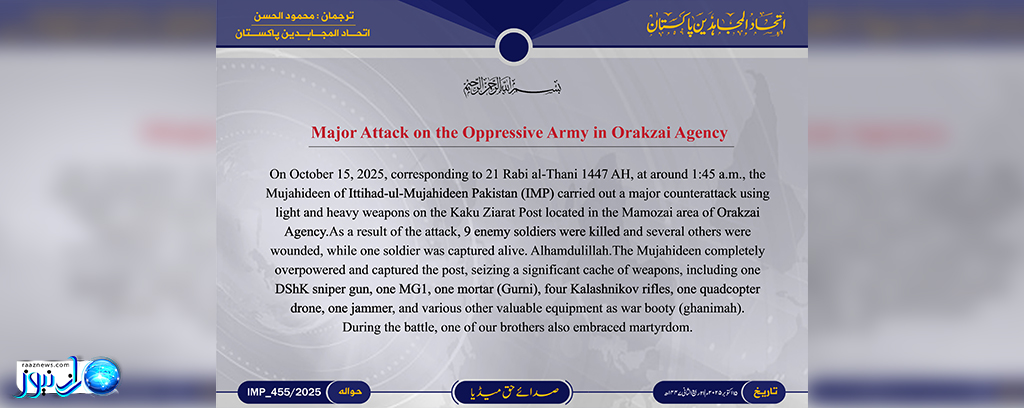 از سوی دیگر ائتلاف تروریستی موسوم به اتحاد المجاهدین پاکستان(IMP) با انتشار بیانیه ای ضمن بر عهده گرفتن مسئولیت این حمله اظهار داشت: مجاهدان ما پاسگاه کاکو زیارت واقع در منطقه ماموزئی شهرستان اورکزئی را حوالی ساعت 1:45 بامداد با استفاده از سلاح های سبک و سنگین مورد حمله قرار دادند.